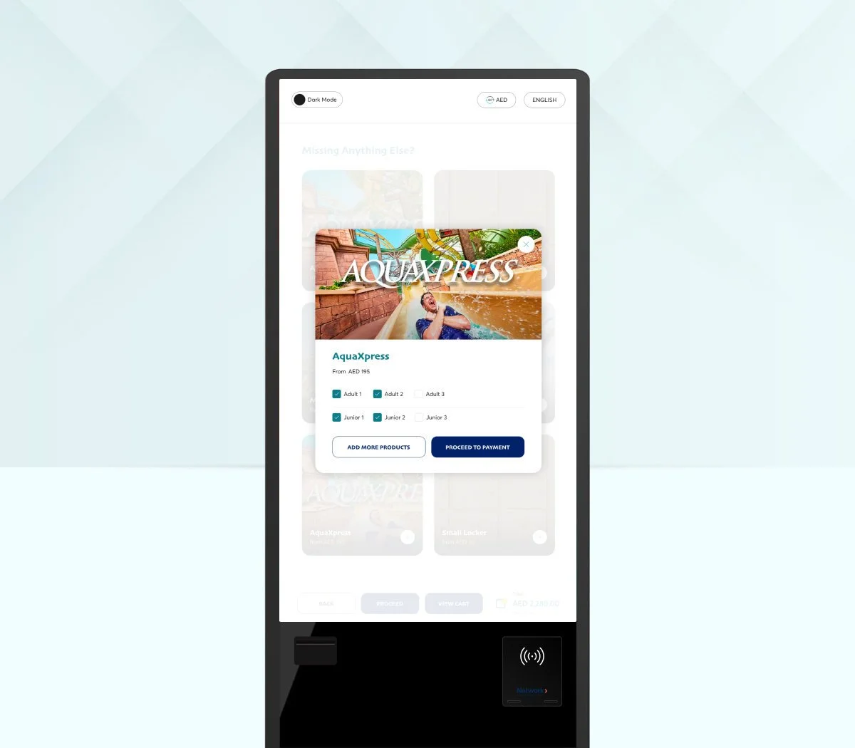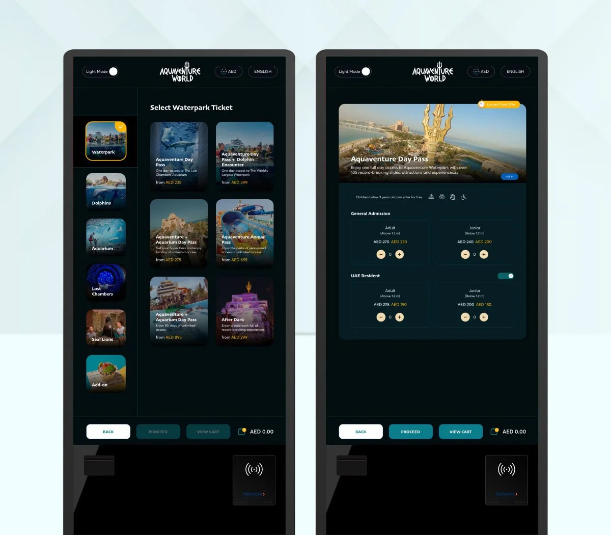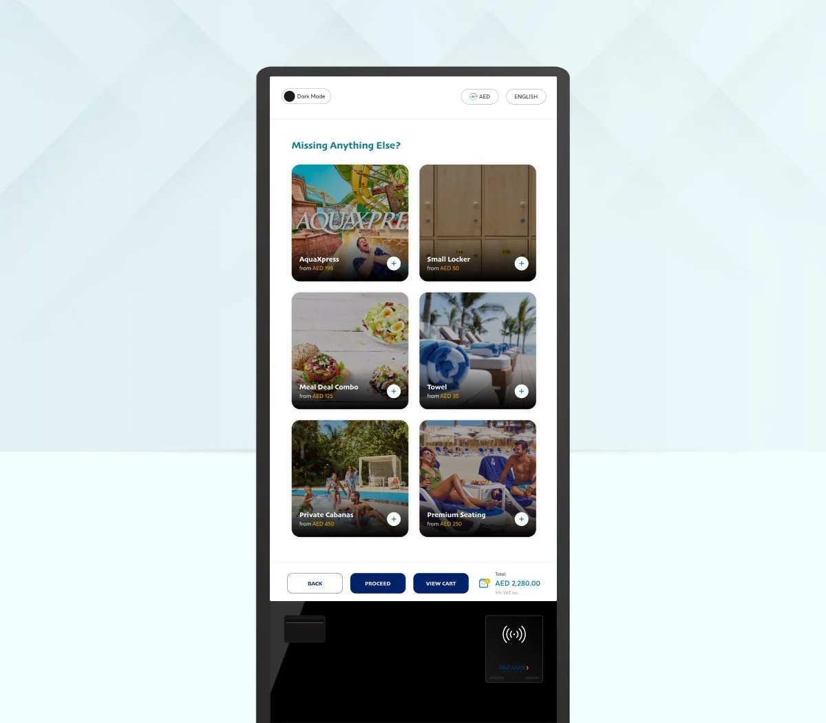 Following an expansion in March 2021, Aquaventure World grew by one third, leading it to break the official Guinness World Records™ title for the Most Waterslides in a Waterpark in September 2022. A new improved digital kiosk design enhancements was developed by keeping branding identity for the users to experience an engaging booking journey.