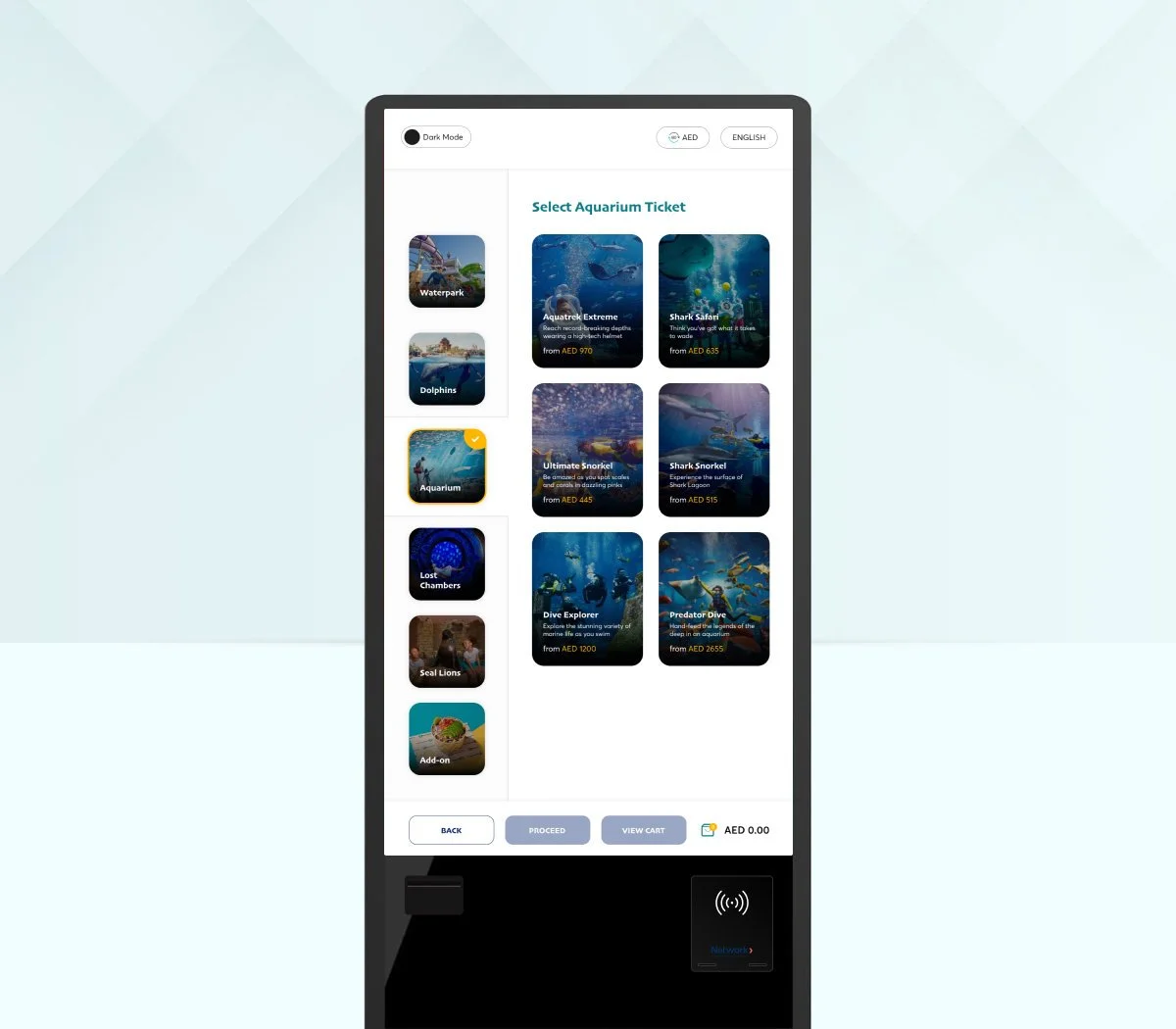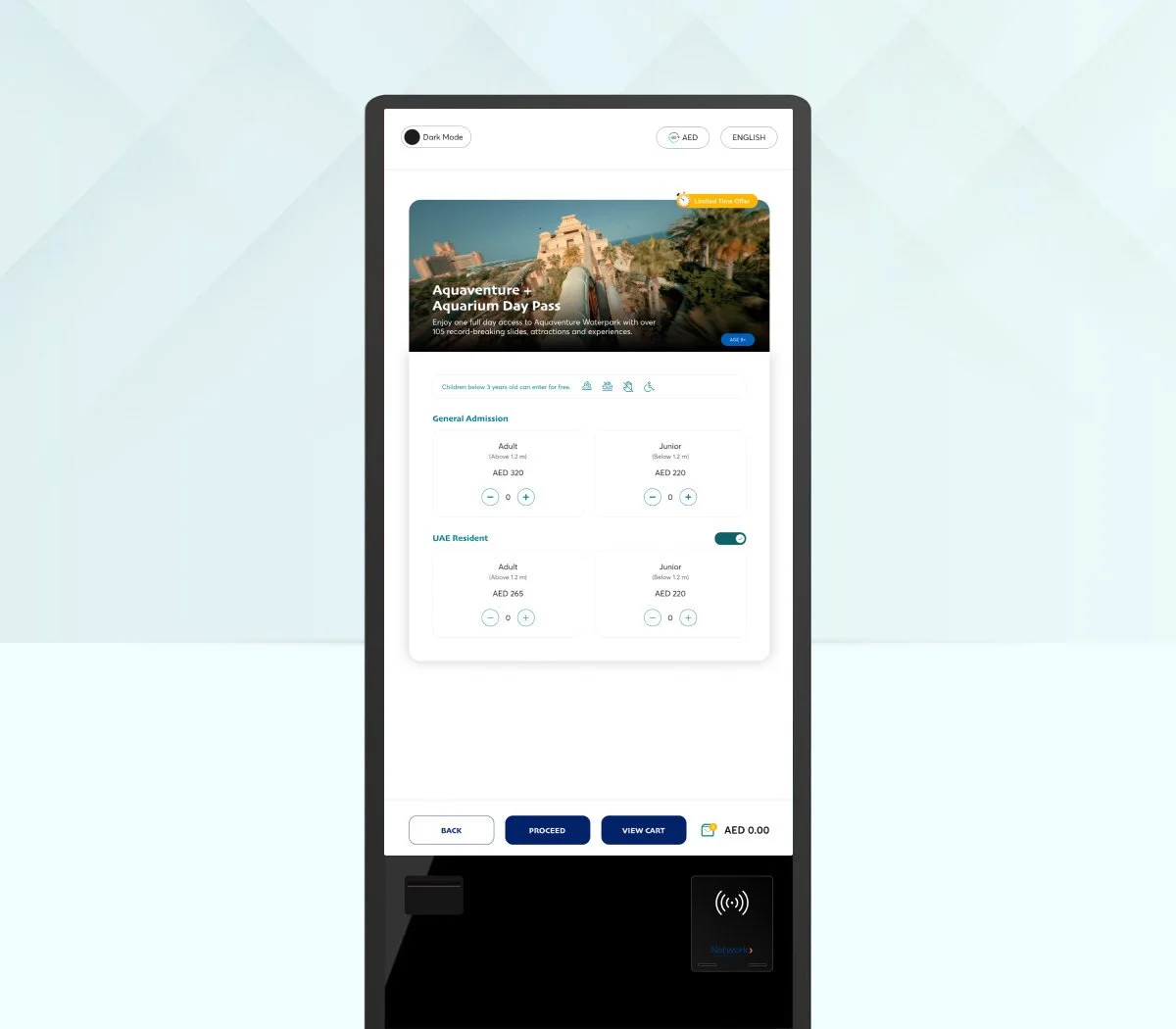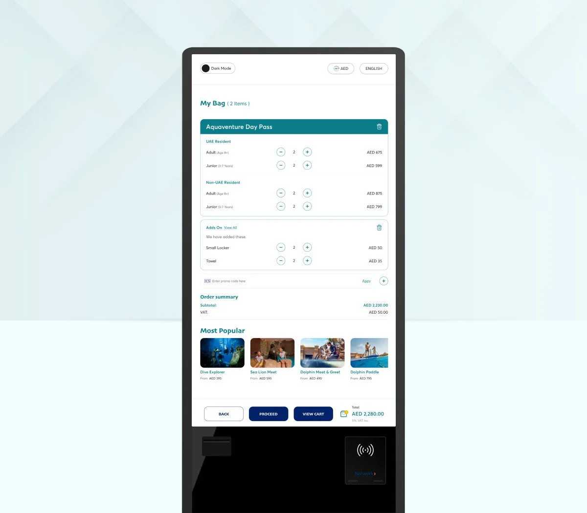 Following an expansion in March 2021, Aquaventure World grew by one third, leading it to break the official Guinness World Records™ title for the Most Waterslides in a Waterpark in September 2022. A new improved digital kiosk design enhancements was developed by keeping branding identity for the users to experience an engaging booking journey.