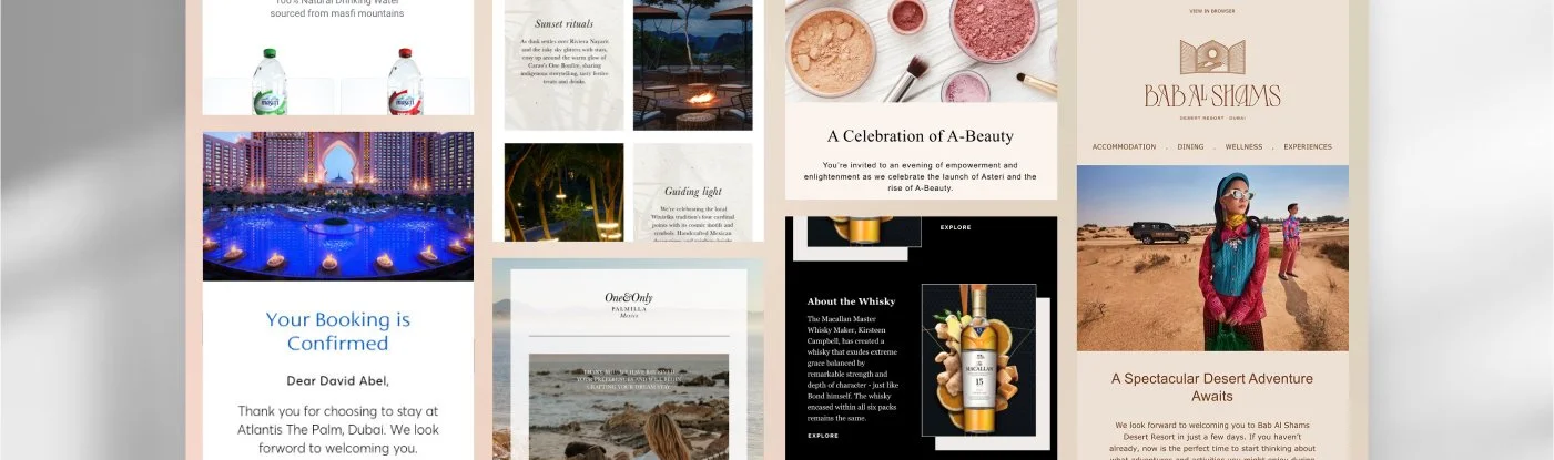 Email designs crafted to elevate every stage of the guest journey — from showcasing luxurious facilities and simplifying the booking process to creating warm welcome experiences and promoting post-stay wellness. Each design blends refined aesthetics with clear communication, enhancing brand connection and guest satisfaction.